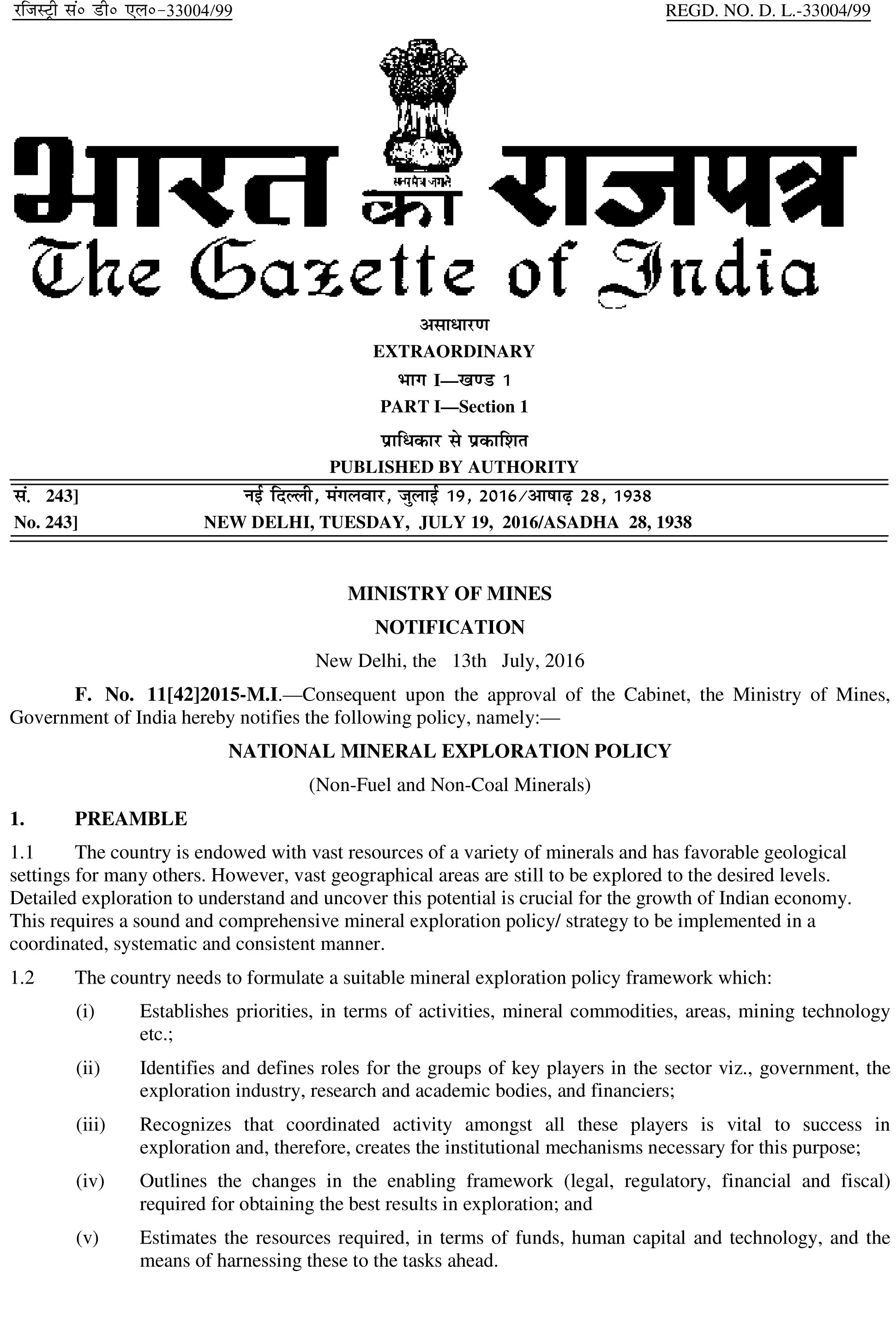 Notification: 19th July 2016 - F. No. 11[42]2015-M.I.